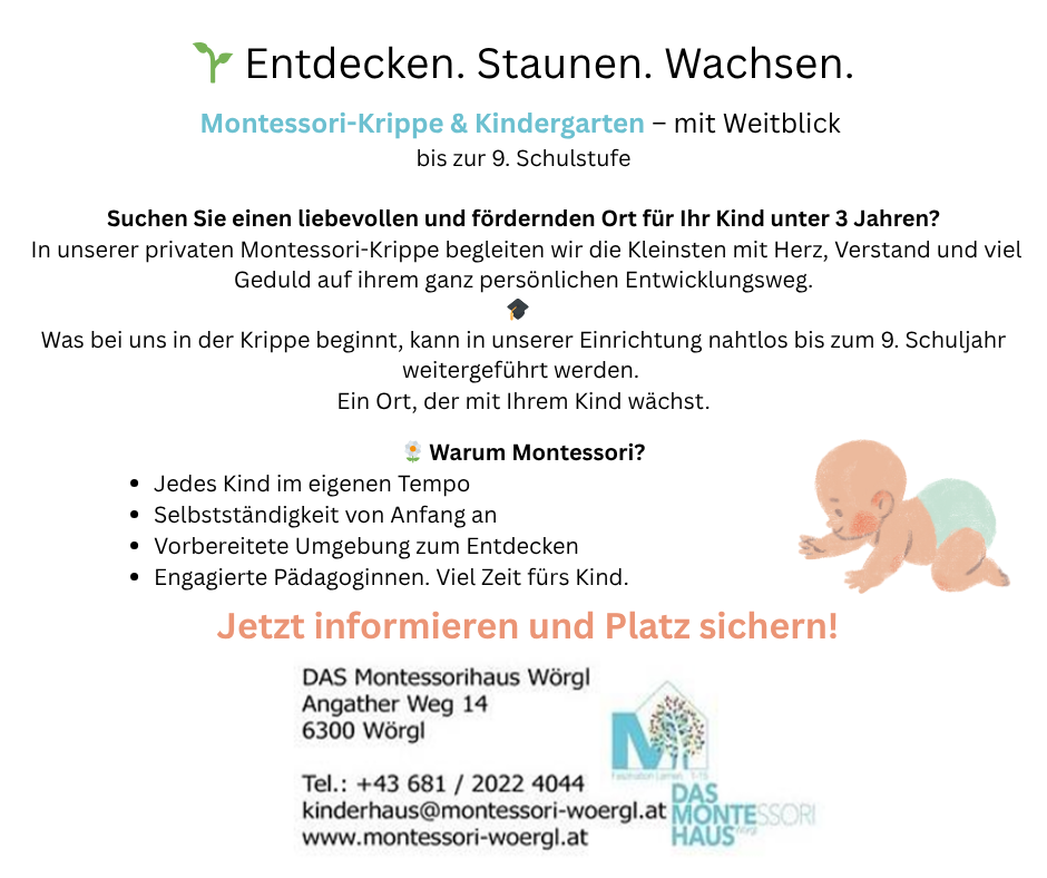 Es ist uns eine Ehre und Freude, Gastgeber der Montessori-Akademie sein zu dürfen! Wir sind Hospitations- und Praktikumsstelle und wir freuen uns zu sehen, wenn die Begeisterung und Freude an der Arbeit mit der wunderbaren Montessori-Pädagogik weitergegeben wird. Vielleicht spricht es gerade dich an, diesen pädagogischen Weg einzuschlagen oder dich als Quereinsteiger*in auf eine völlig neue berufliche Herausforderung einzulassen? Es gibt viele Möglichkeiten dazu - informiere dich unter www.montessori.at. 10.6.2022
