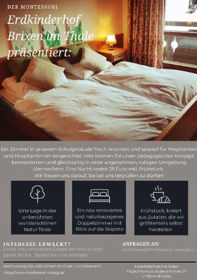 Das Ergebnis ist ein harmonisches Zimmer, das unseren Gästen eine angenehme und entspannte Atmosphäre bietet. Bereits drei Gäste haben in diesem neu renovierten Zimmer übernachtet und uns positives Feedback gegeben. Sogar die Präsidentin der Österreichischen Montessori Gesellschaft Dr. Alexandra Stieger durften wir schon zu unseren Gästen zählen und sie hat sogar schon über den ÖMG-Newsletter in ganz Österreich bei Montessori-Einrichtungen für uns Werbung gemacht!